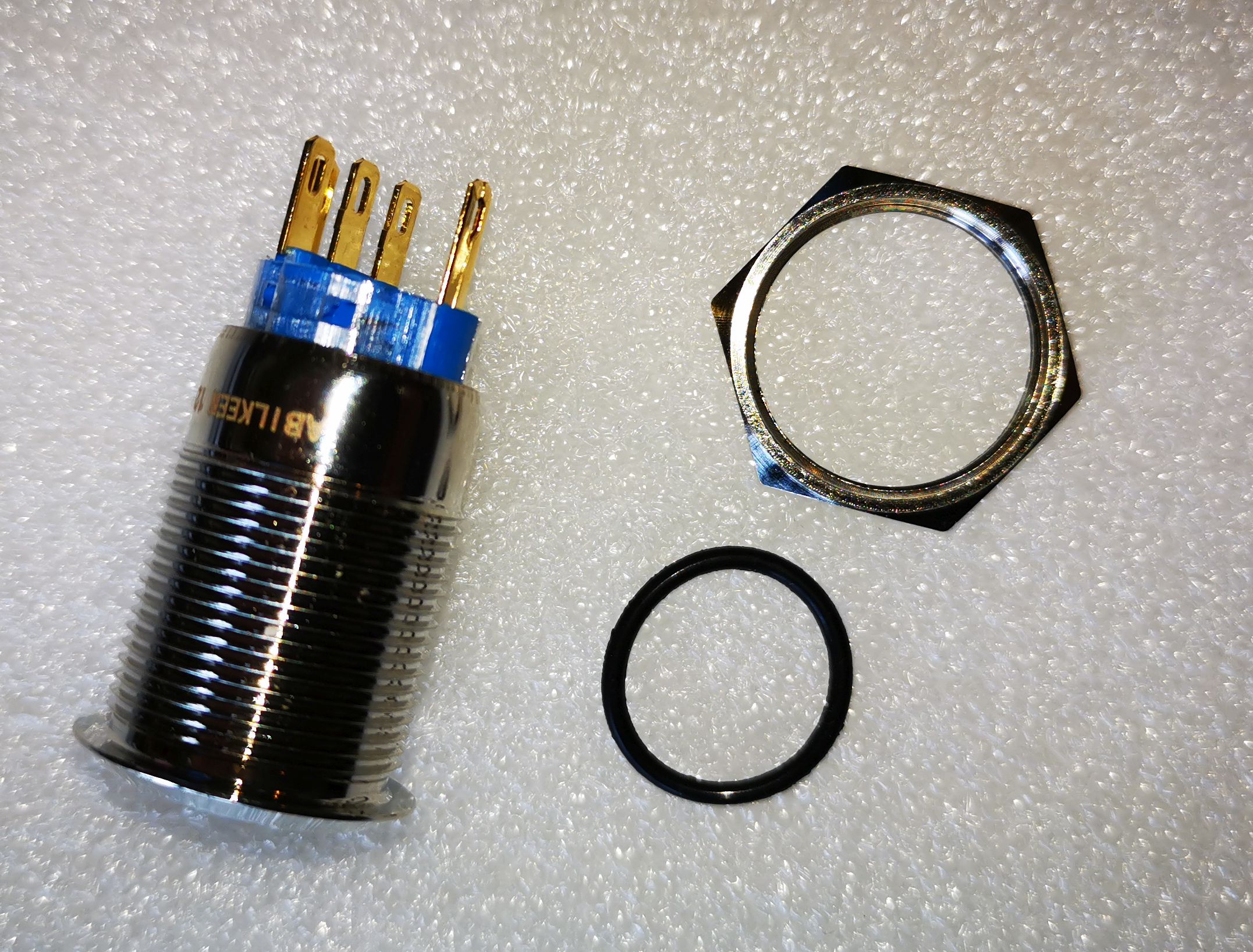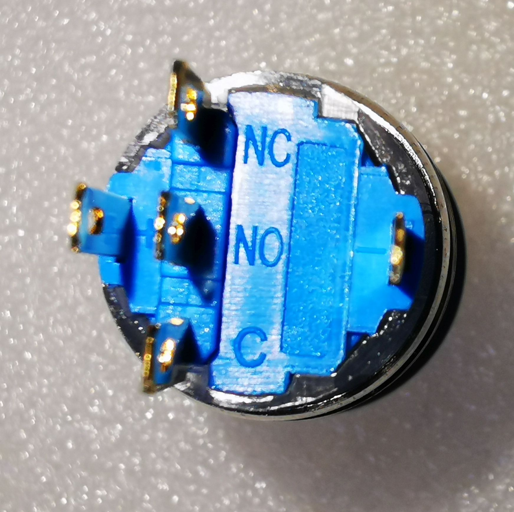 Poussoir momentané anti-vandalisme en acier inoxydable NO/NC IP65 sorties cosses à souderPerçage 19mm Inverseur Avec LED bleue 12V |