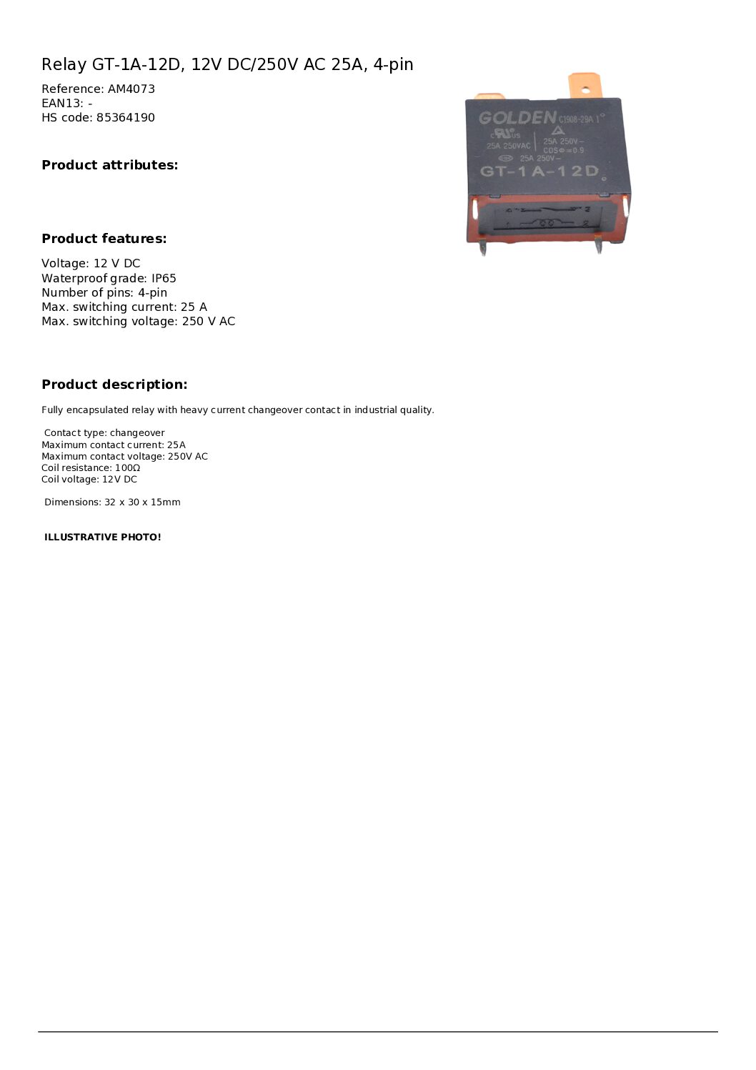 RELAIS BOBINE 12Vdc – 1 contact 25A @ 250Vac – GT1A12D